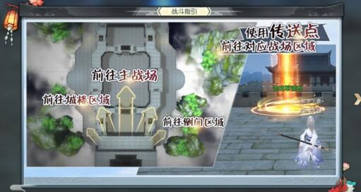 帮会领土战分为三部分区域,分别为主战场、城楼区域、侧门区域。使用出生点的传送点可前往对应战场区域。