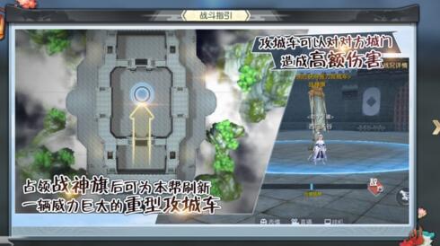 在主战场中占领战神旗后,可为本帮刷新一辆威力巨大的重型攻城车,攻城车可以对对方城门造成高额伤害,攻城车需要两人驾驶,一人控制攻击,一人可控制位移、推人等。
