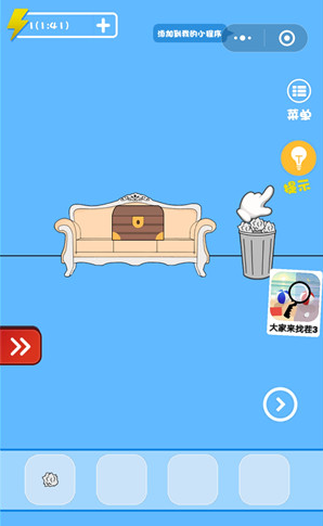 4、将饮料倒入老爷爷杯子,之后就可以扯开老爷爷坐着的垫子拿到钥匙