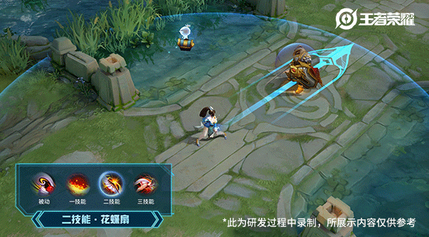 技能特效:在保留不知火舞“火”元素的基础上,选择了更为神秘的蓝色气焰效果。同时还加入了扇形碎片、狮猫影子等元素作为辅助,使角色更加丰满。为了突出不知火舞魅语的狮猫幻化身份,在局内每次释放技能或被动触发时,都有猫尾残影在人物身上显现