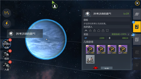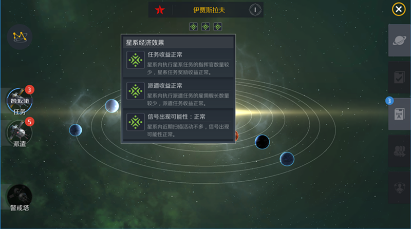 星系任务刷新时间长,一次可以在本星系提供三次任务收益,收益大小跟随本星系富饶度决定,星系富饶度越高,任务等级越高,奖励越高。