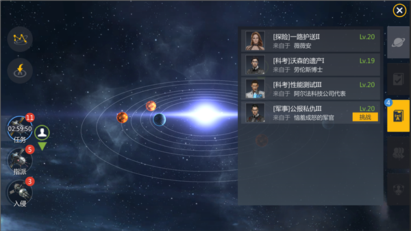 指挥官可以在任何星系内,在星图界面中使用任务探针,扫描星系中当前存在的星系任务。扫描到的星系任务将进入指挥官的可接任务列表,指挥官可以在列表中查看任务详情并选择是否接取任务。同时接取任务的数量没有限制。如果不满意星系任务,可以重新进行一次探针扫描,这将重新获取一批新的任务。