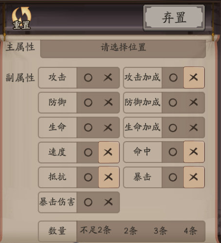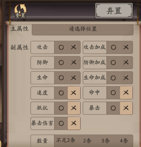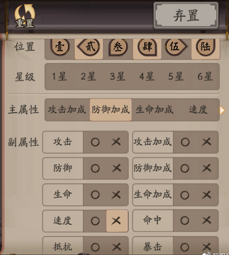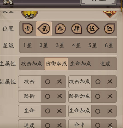 3,然后全部取消叉,在所有四条属性里面选,二号位置主防御加成的全部弃置
