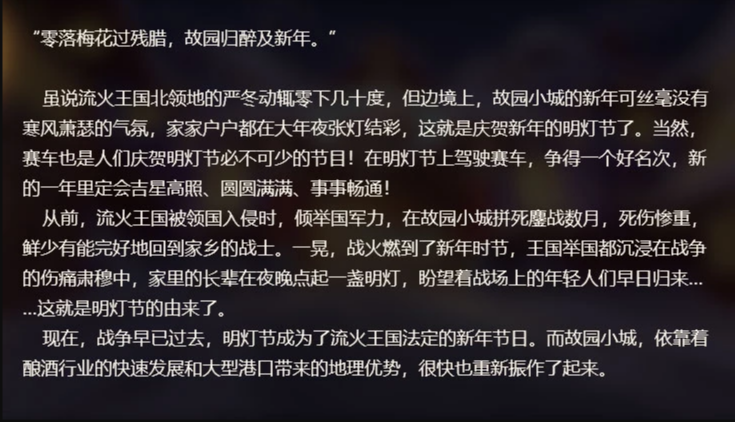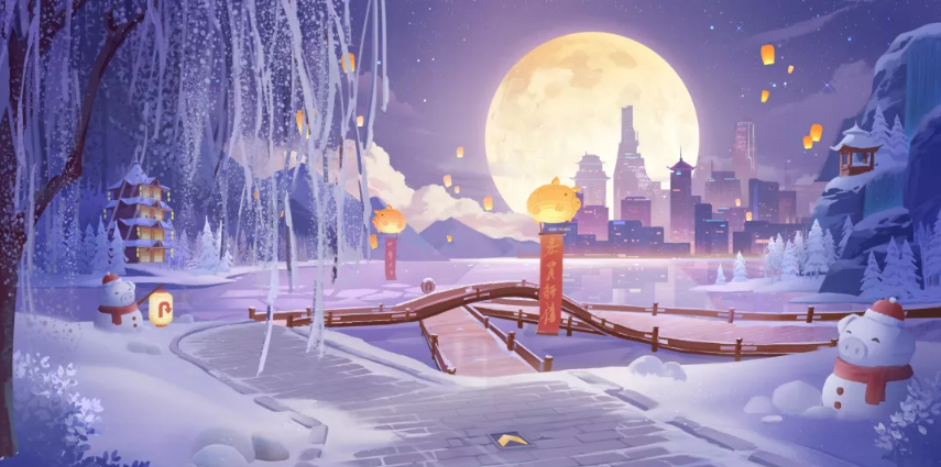 雪山巍峨,朵朵雪花从空中飘落,静听雪落下的声音;霓虹闪烁,湖面结了厚厚的冰,踱步于冰湖上的木桥。小猪雪人挑着灯笼指引方向,酿酒坊里灯火通明,酒香四溢,张灯结彩庆祝着新年的到来。赛道边,积雪已除,彩灯已亮;故园里,梅花已开,美酒已酿,静等各位赛车手的到来!
