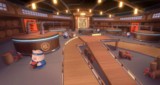 酿酒坊里哪儿都是勤快又可爱的打工小猪~车手们可别被它们吸引住咯,注意前方弯道!