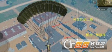 注意落脚尽可能保证在上图的红线区域,忌贪恋楼顶物资,红框区域如果没有趁手武器此时应当立从楼梯口下到二楼,寻找武器,避免被顶层有武器的敌人击倒。同样如果对手位置过近,到楼梯口还需要一定的时间,那我们还可以直接从红点区域天窗直接落下,速度更快。