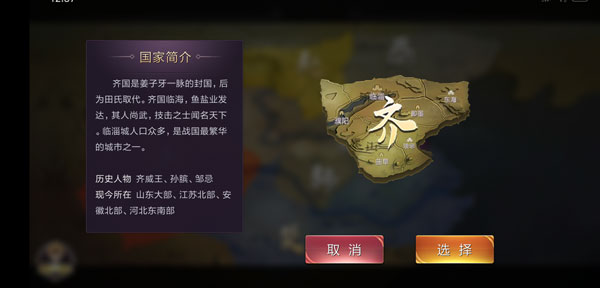 齐国简介:齐国是姜子牙一脉的封国,后为田氏取代。齐国临海,鱼盐业发达,其人尚武。技击之士闻名天下。临淄城人口众多,是战国最繁华的城市之一。