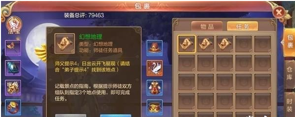幻想地理:师徒背包里会获得3个任务道具,需要根据提示诗句师徒同时点击道具完成(俗称找位置)。