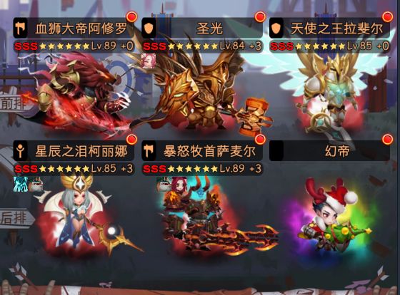 这个套路相对前两个还是没那么省心,需要适当的变化站位,有时候还要多上一个正义。有时候把圣光或星辰换成元素或女主,基本思路还是其他物理垫刀,血狮一波,适用10%左右的图。